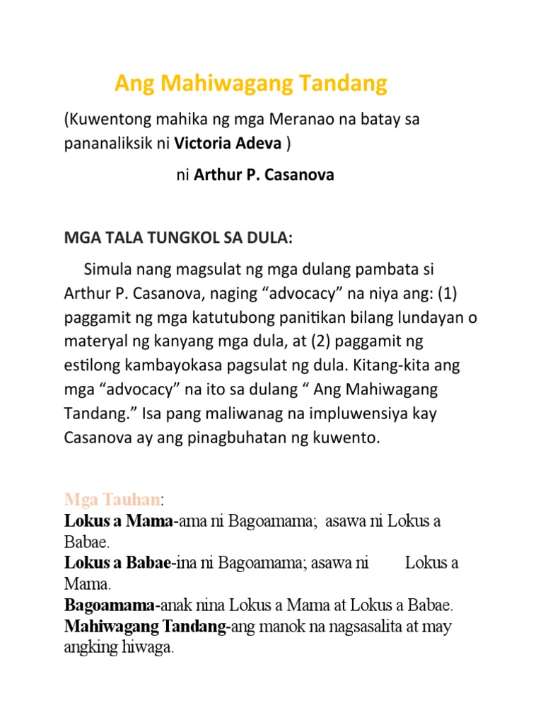 Buod ng kwentong ang mahiwagang tandang. Casanova Dulang pambata ang iskrip na Ang Mahiwagang Tandang Maaari itong itanghal bilang dulang mascara o dulang anino na nasubukan na ring gawin ni Casanova sa kanyang klase. Ang kwento ng Mahiwagang Manok ay tumutukoy sa alamat na pinagmulan ng manok na tandang.