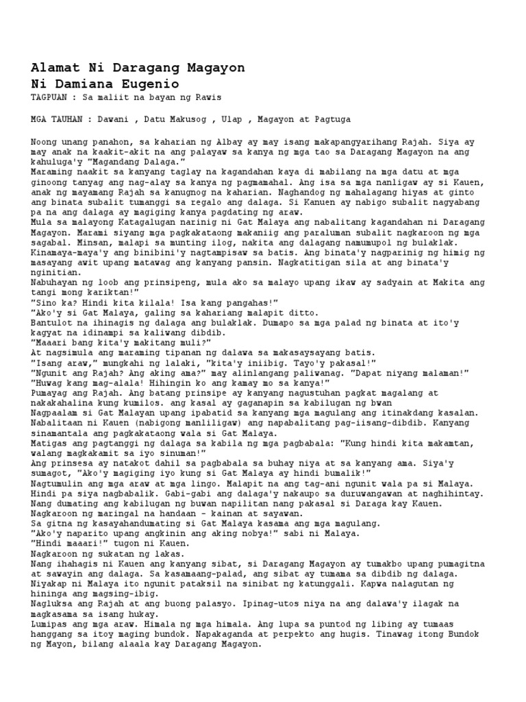 Buod ng Alamat ng Bulkang Mayon. Magayon was the only daughter of Makusog strong the tribal chief of Rawis and Dawani rainbow who died shortly after giving birth to her. Alamat ni daragang magayon pagsusuri.