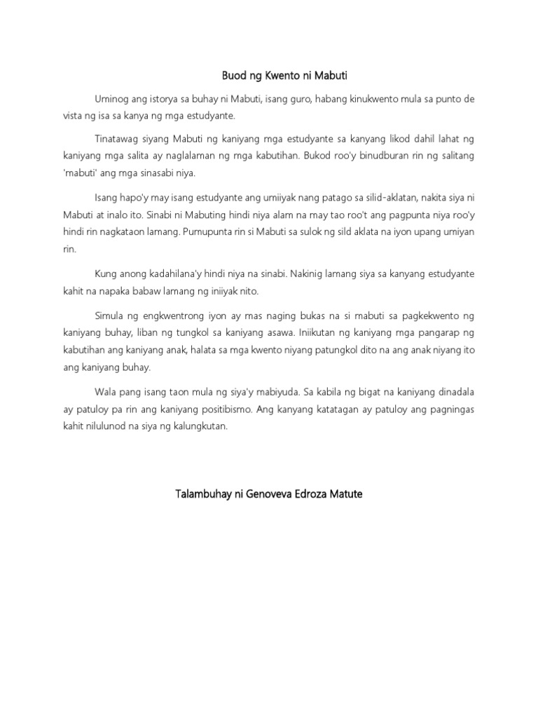 Ang Kwento Ni Mabuti. Hindi man ito ang kaniyang tunay na pangalan ngunit ito ang naging tawag sa kaniya dahil hilig niyang. Layunin ng buod.