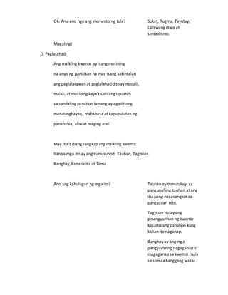 Mayroong limang5 bahagi ang. Malalaman mo ang mga elemen. Naiuugnay ang ilang pangyayari sa kuwento sa tunay na buhay 3.