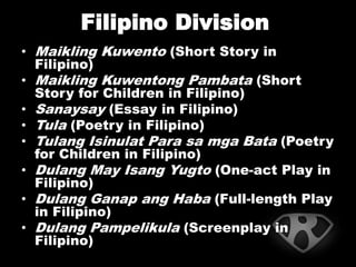 Ang larangang pinagkakalooban dito ay ang maikling kwento dula at tula.