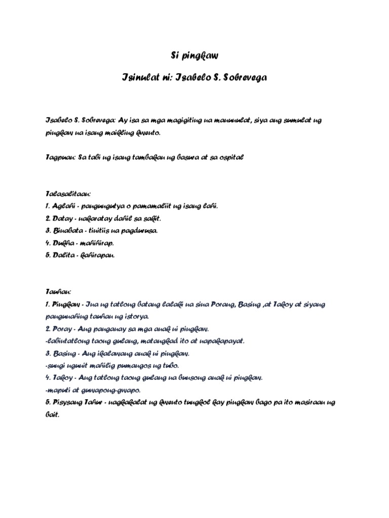 Tagpuan sa maikling kwento na si pinkaw. Namamatay ang mga tao sa gutom dahil. Si Pinkaw maikling kwentong hiligaynon ni Isabelo S.