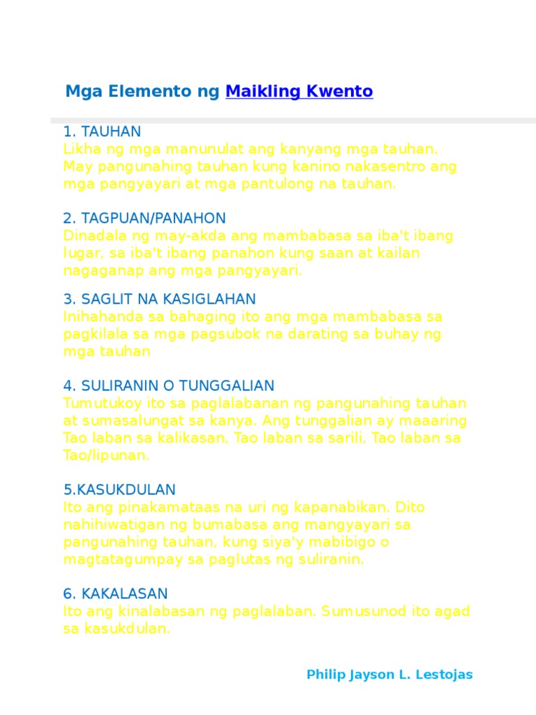 Isang uri ng kathang-isip na panitikan kung saan mga hayop o kaya mga bagay na walang-buhay ang. Ang tatlong bahagi ng kwento ay. KUWENTO MAIKLING KUWENTO isang kathang pampanitikang ang layuniy maglahad o magsalaysay ng isang maselan at nangingibabaw na pangyayari sa.