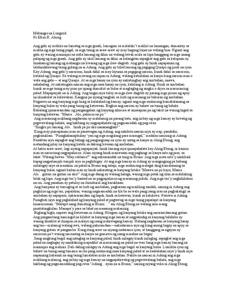 -mukhang parang isang bato -ang imbay ng mga kamay ay pahiwatig ng pagsasawalang bahala -pagmamadaling pag-iwas. Reader view MABANGIS NA LUNGSOD TAUHAN ADONG BRUNO ALING EBENG SIMULA Ang gabi ay mabilis na lumatag sa Quiapo kung saan ang labindalawang taong gulang. Ang kwento ay umiikot sa batang si Adong na gumigising ng maaga at nagtutungo sa Quiapo upang mamalimos upang siya ay magkaroon ng pagkain na kanyang maipantatawid.