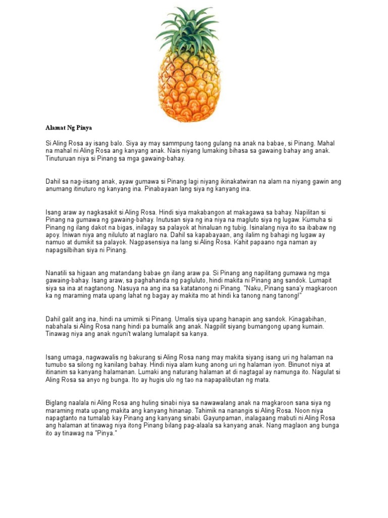 Contextual translation of halimbawa ng suring basa alamat ng pinya into. Julie orourke husband ژوئن 3 2022 hobart hockey news on halimbawa ng alamat ng bayan. Mabait si Pina subalit siya ay may karamdaman at may kalabuan sin ang kanyang mga mata ngunit hindi ito dahilan upang hindi niya sundin ang mag ipinag-uutos ng kanyang mga magulang.