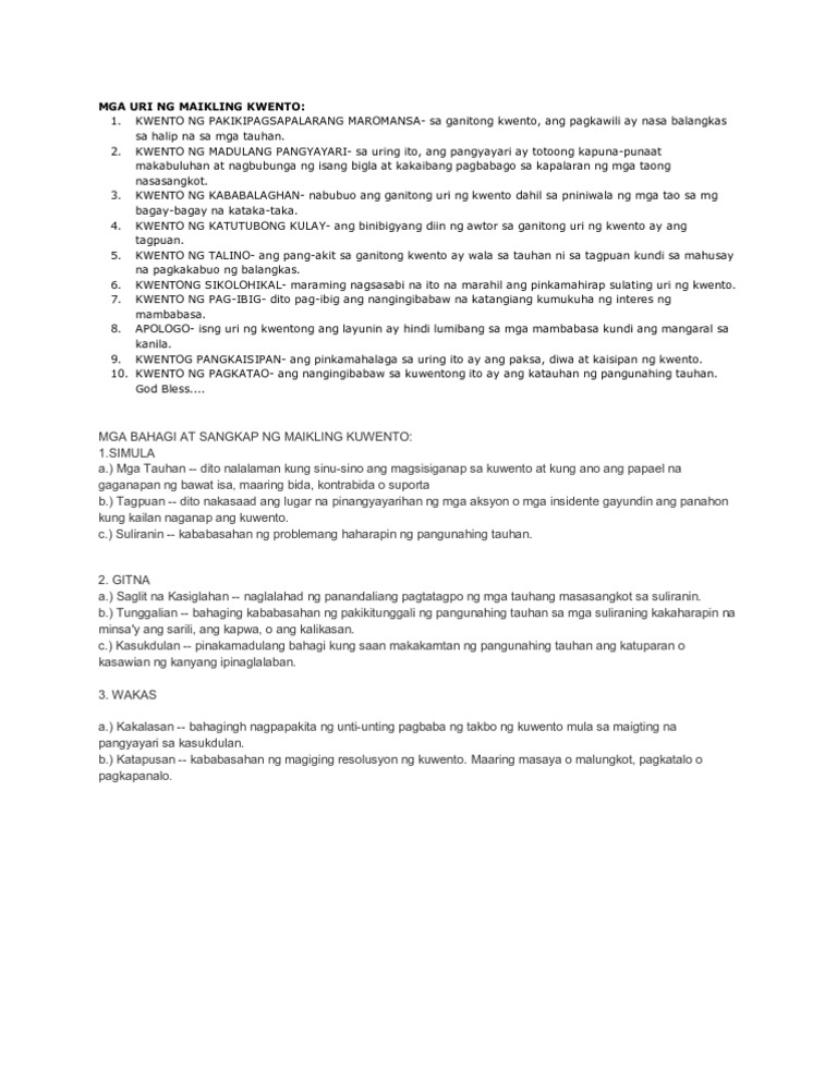 10 uri ng maikling kwento - 1081782 jajaaa4854 jajaaa4854 19112017. Ito ay maaring likhang isip lamang o batay sa sariling karanasan na nag-iiwan ng isang kakintalan sa isipan ng bumabasa onakikinig. At nagsasalaysay sa akda.